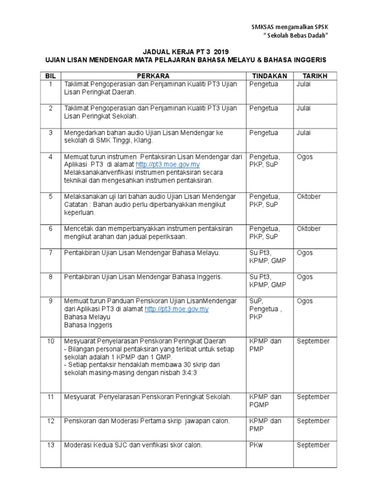 2019_Lembaga Peperiksaan Kementerian Pendidikan Malaysia 3 JADUAL KERJA PENTAKSIRAN TINGKATAN 3 PT3 TAHUN 2019 Catatan. Berikut dikongsikan jadual waktu peperiksaan PT3 yang merangkumi tarikh masa kod kertas nama kertas dan masa peperiksaan dijalankan. Tajuk Tugasan Kerja Kursus Sejarah PT3 2019 Dan Tahun.