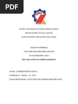 KOLEJ VOKASIONAL SUNGAI PETANI 2 DIPLOMA SENI REKA SENI REKA FESYEN NAMA. 011219-02- KOD DAN NAMA KURSUS. The Seni Reka Fesyen Department at Kolej Vokasional Sungai Petani 2 on Academiaedu.