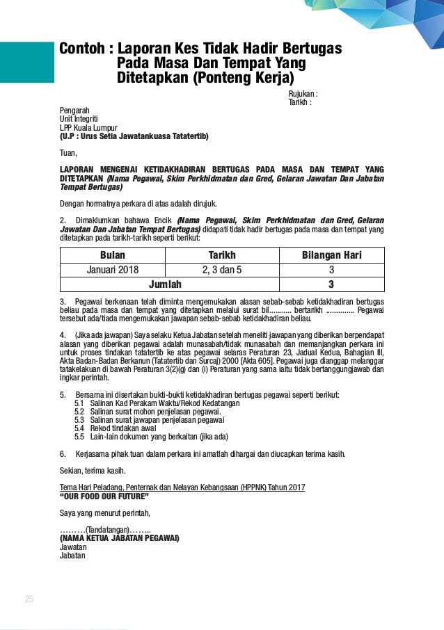 Kelakuan dan Tatatertib 1993 tidak hadir bertugas bermaksud tidak hadir bagi apa-apa tempoh masa pada masa dan di tempat di mana pegawai itu dikehendaki hadir bertugas serta tidak. Jalan yang terbaik untuk. Contoh surat tunjuk sebab tidak hadir bertugas october 2 8 2 01 1 by razlan 1 comment ponteng tugas atau disebabkan faktor yang tak dapat dielakkan.
